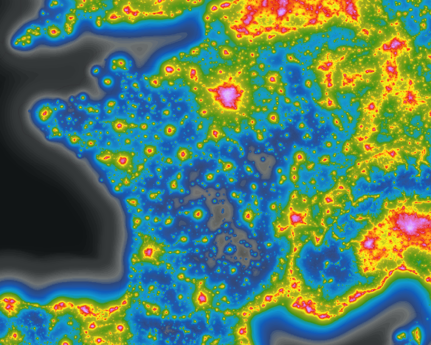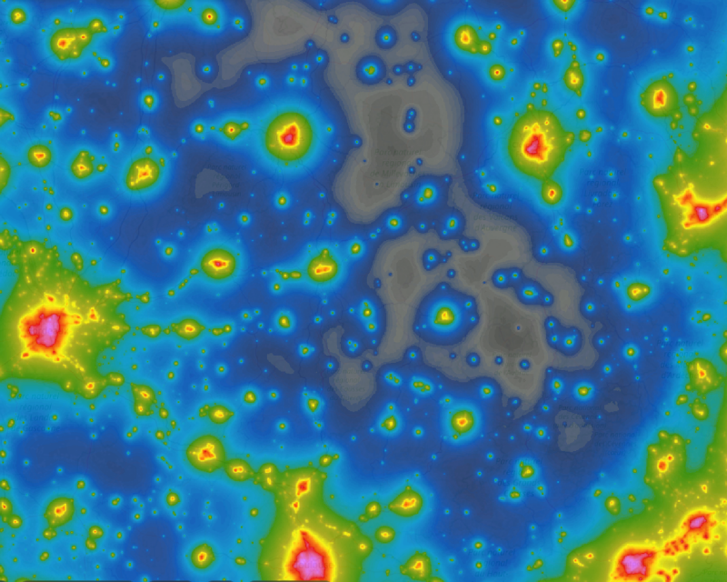 Atlas de Pollution Lumineuse rassemblant les sources lumineuses les plus faibles et leurs impacts sur les territoires alentours. Il additionne la carte des sources lumineuses et un atlas de cette dernière en une seule carte.